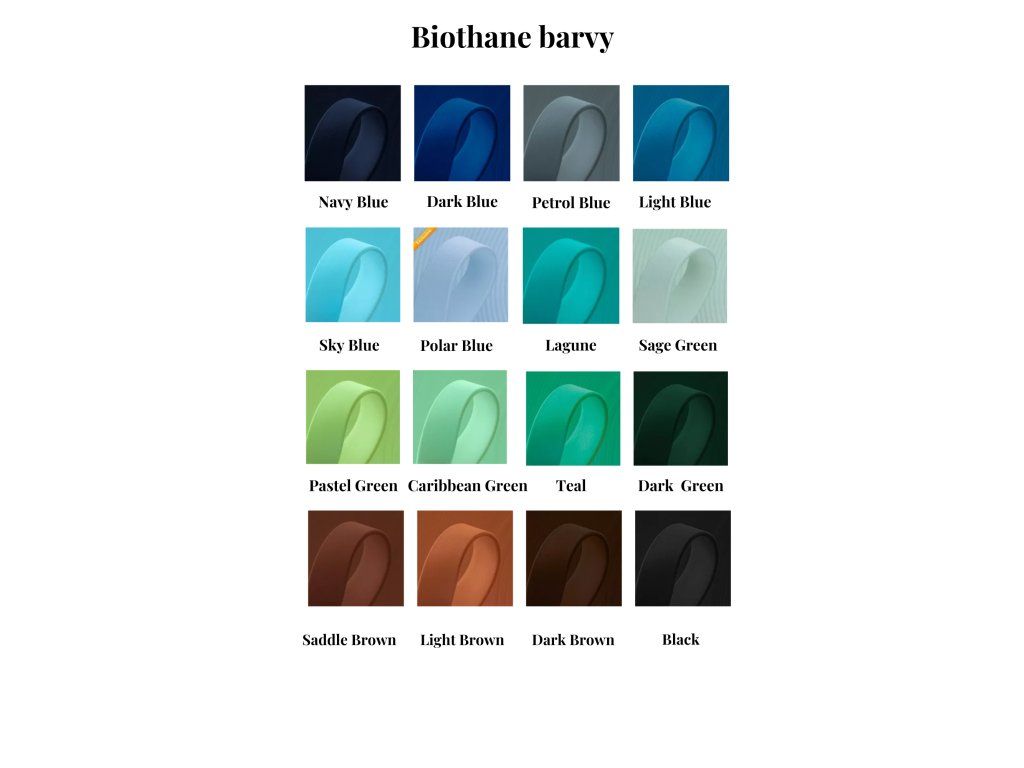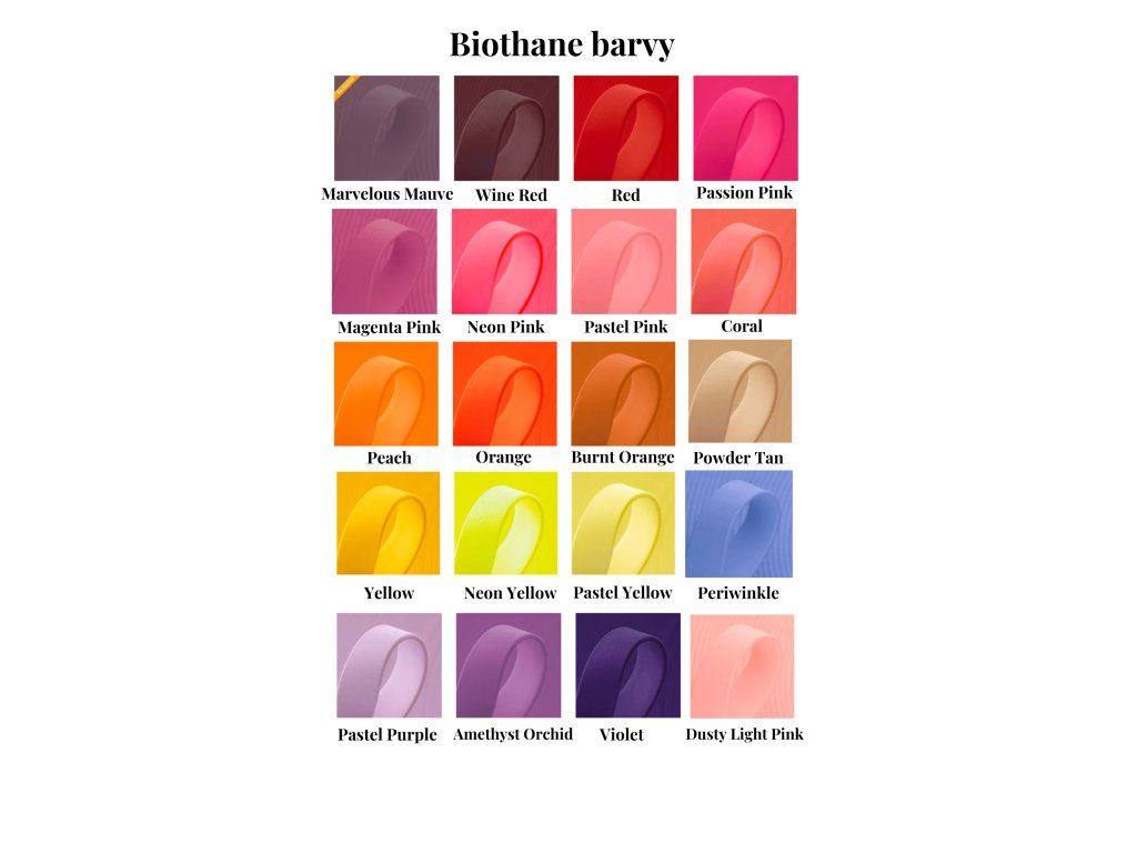Barvy Biothane popruhů se mohou ve skutečnosti mírně lišit od fotografií, protože každý monitor zobrazuje barvy odlišně.